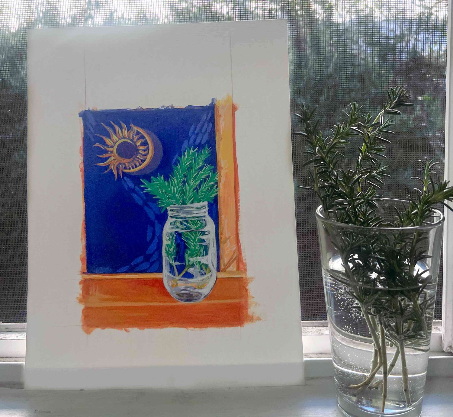 Acrylic on paper. Expect art with bold colors and scenes that feel magical